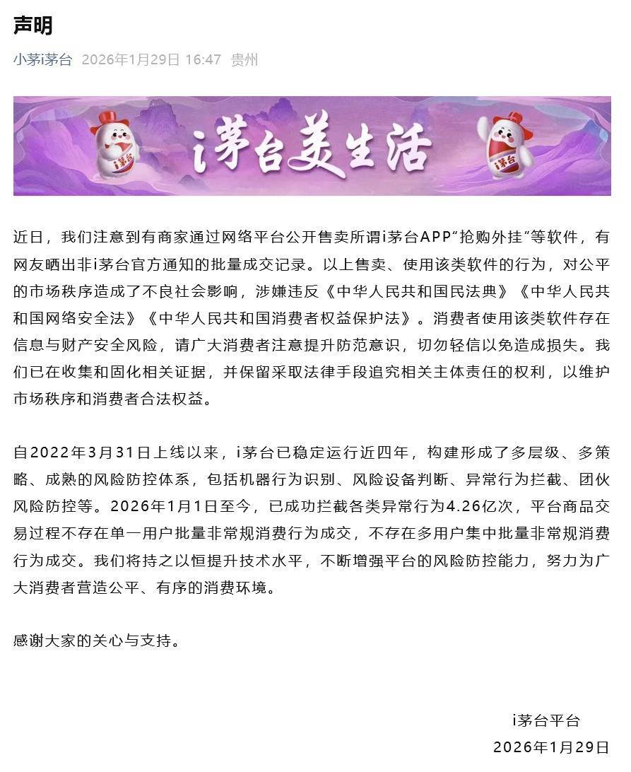 贵州茅台默示,自2022年3月31日上线以来,i茅台已踏实初始近四年,构建形成了多层级、多计策、熟谙的风险防控体系,包括机器行径识别、风险诞生判断、非常行径阻难、团伙风险防控等。2026年1月1日于今,已成效阻难各样非常行径4.26亿次。平台商品往来历程不存在单一用户批量超越规铺张行径成交,不存在多用户逢迎批量超越规铺张行径成交。