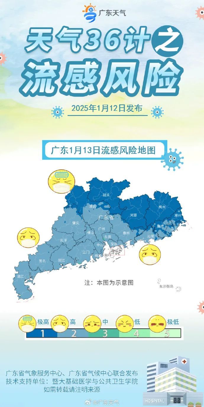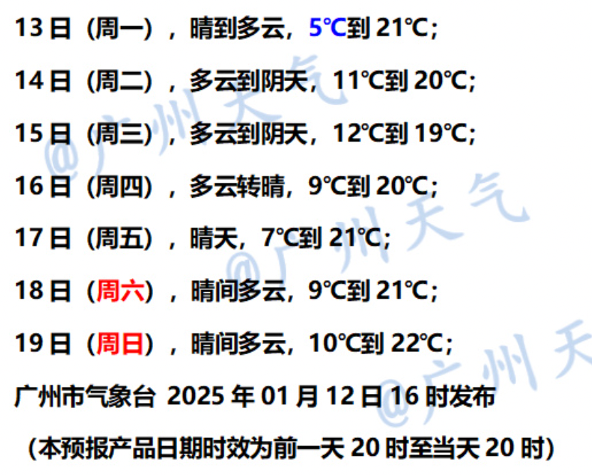 1月13日,南部市县晴转多云,其余市县晴间多云。最低气温:粤北市县0~3℃,高寒山区零下4~0℃,有冰冻和霜冻,南部沿海市县8~11℃,其余市县4~8℃。