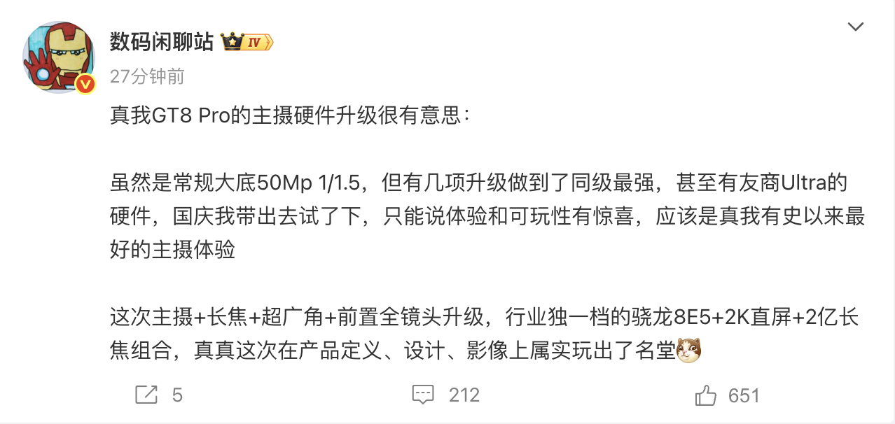 据博主默示,天然是惯例大底50Mp 1/1.5,但有几项升级作念到了同级最强,以致有友商Ultra的硬件,国庆带出去试了下,只可说体验和可玩性有惊喜,应该是真我有史以来最佳的主摄体验。此次主摄+长焦+超广角+前置全镜头升级,行业唯独档的骁龙8E5+2K直屏+2亿长焦组合,真真此次在产物界说、缠绵、影像上属实玩出了时势。