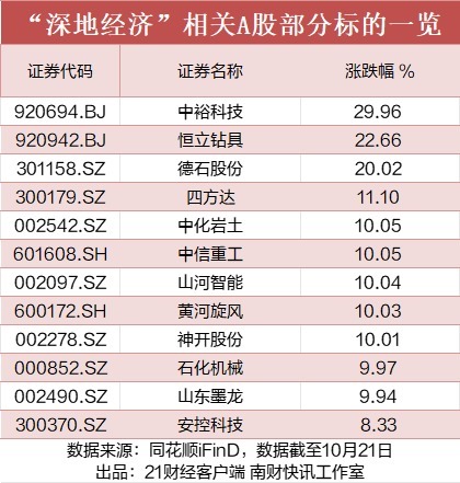 10月21日,“深地经济”宗旨走强,中裕科技(920694.BJ)30cm封板,神开股份(002278.SZ)、石化机械(000852.SZ)、德石股份(301158.SZ)等多股两连板。