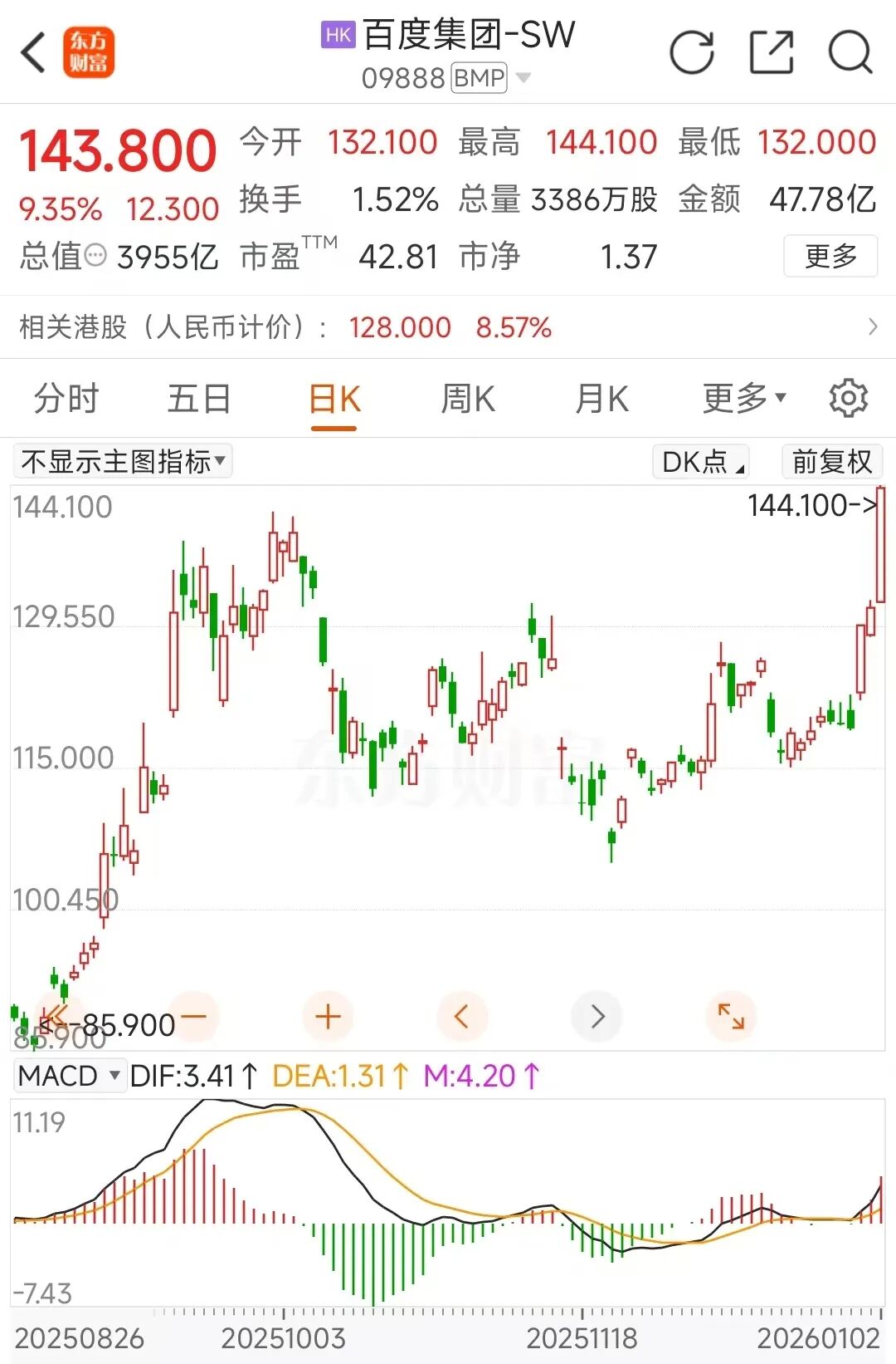 受此利好音问影响,1月2日百度集团港股大涨,抛弃收盘,涨幅为9.35%,当今总市值3955亿港元。按盘中最高的144.1港元来看,创下2023年9月6日(含)以来的两年多新高。